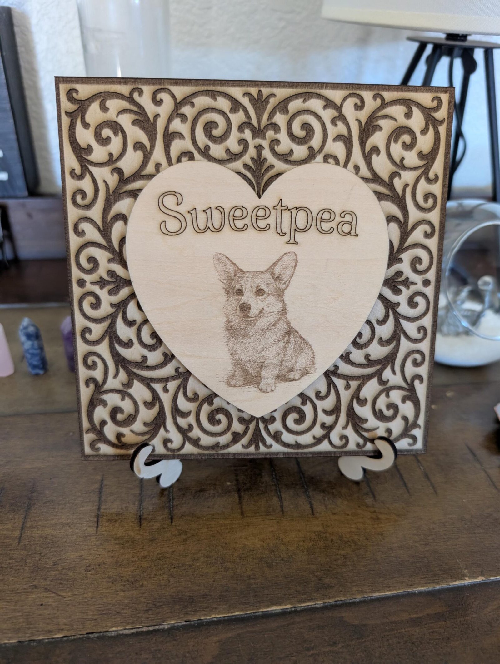 Seal your favorite face (or furry friend!) in woodsy, wuvvy wonder! We take your photo and laser-engrave it onto a sweet heart-shaped wooden plaque, then nestle it on a beautifully etched square background for extra charm and major “aww” factor. Comes with a display stand so it’s ready to steal the spotlight on any shelf, desk, or altar of love.