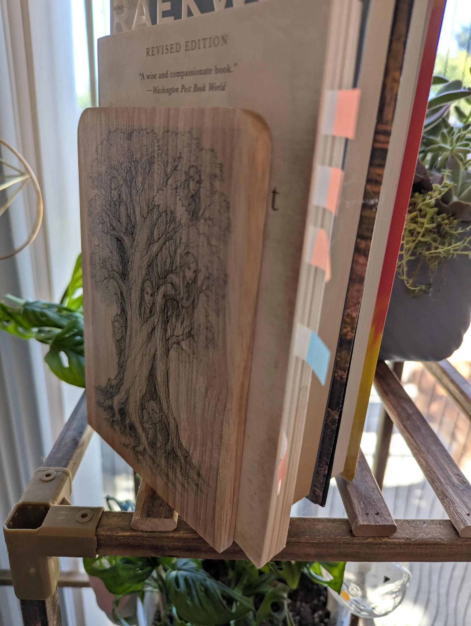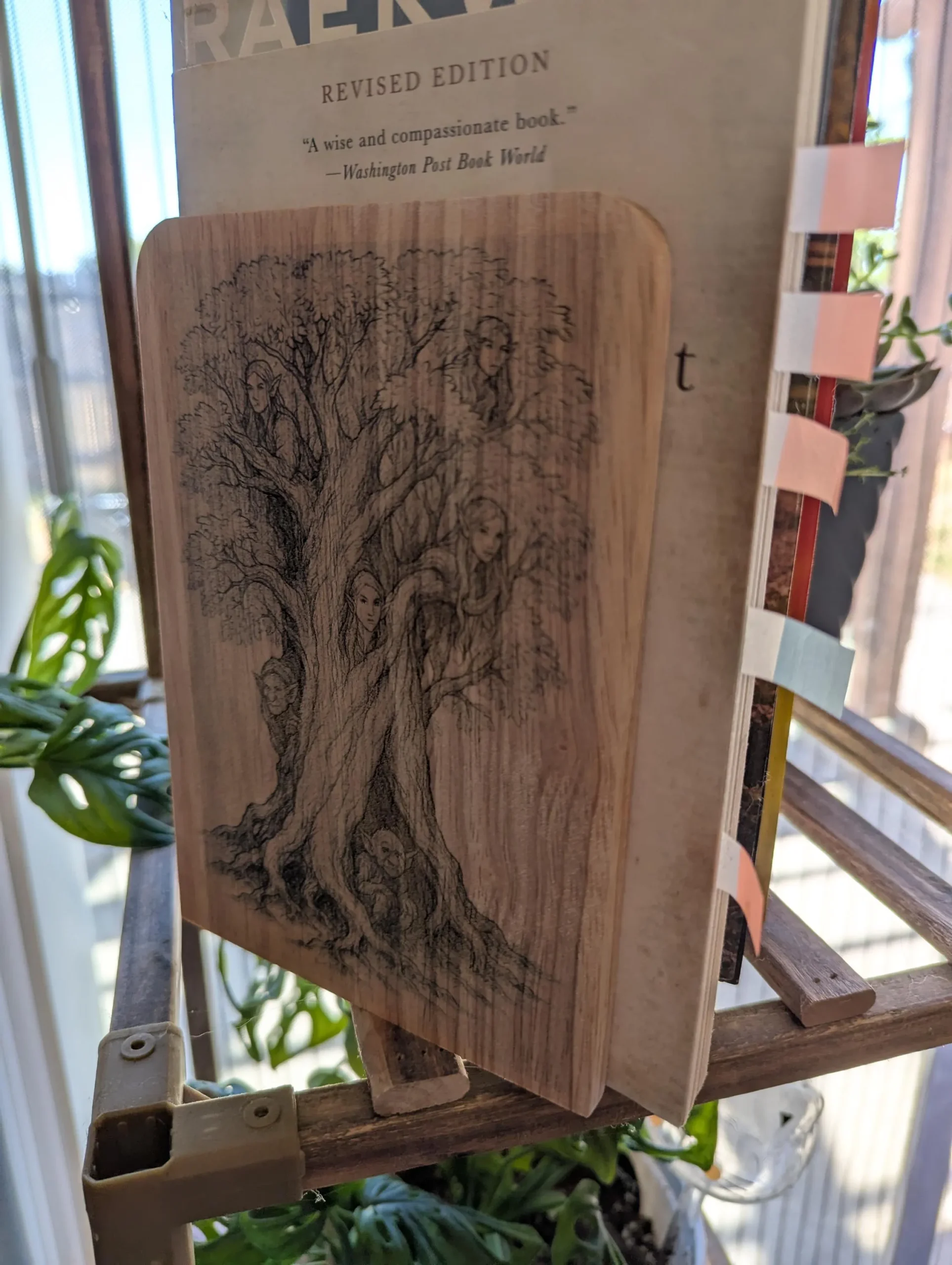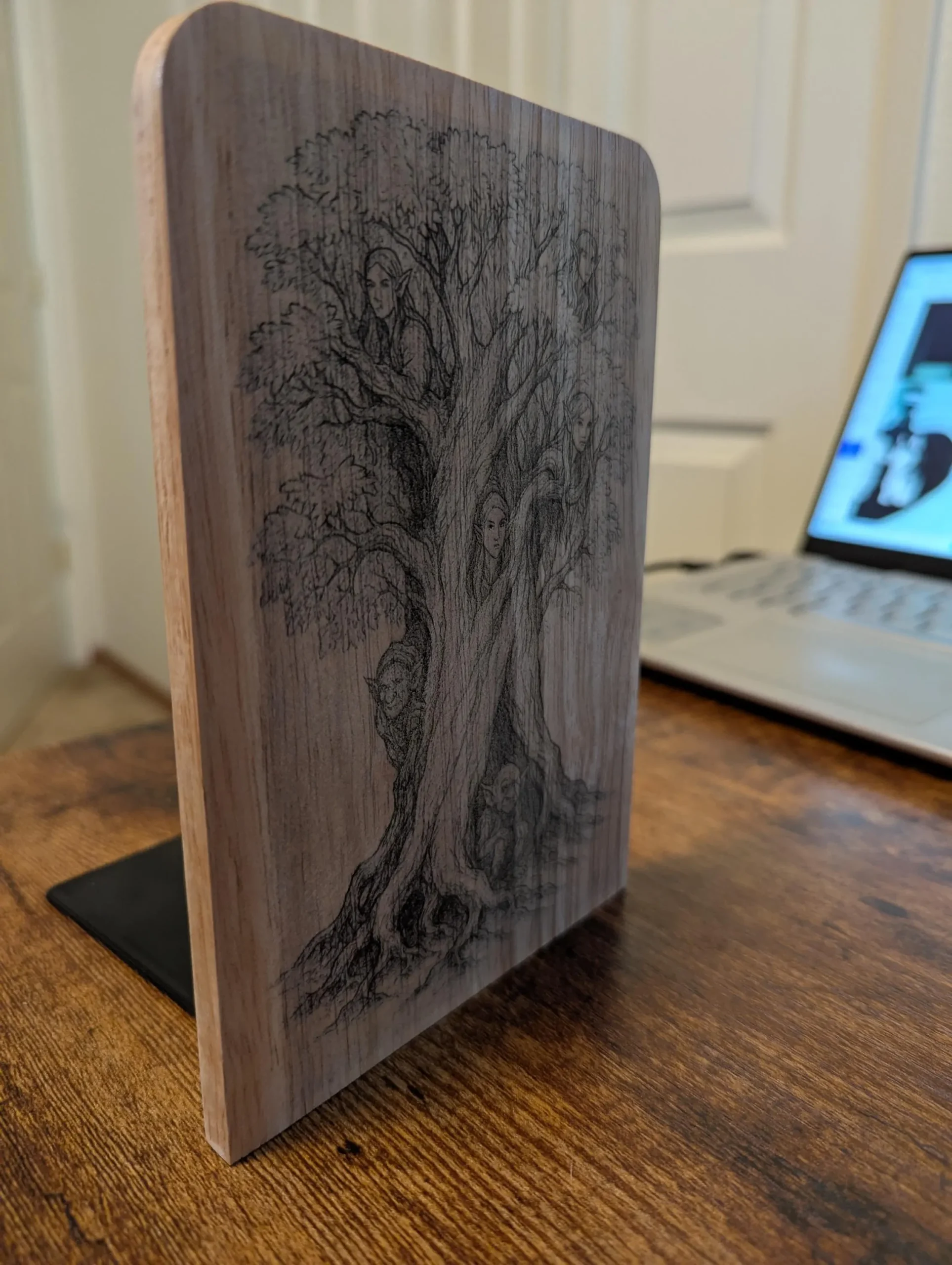 Bring a touch of woodland magic to your bookshelf with this handcrafted wooden bookend, etched with a mysterious and enchanting design of elves nestled within the branches of an ancient tree. It’s more than a bookend—it’s a portal to another realm.