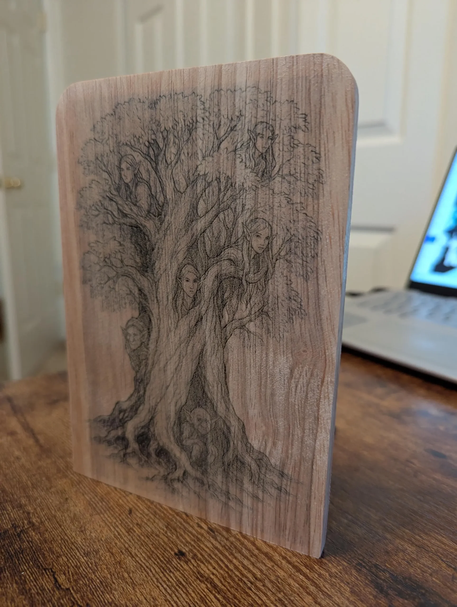 🌳 The tree, full of gnarled roots and secret passageways, is lovingly engraved into natural wood for an earthy, timeless feel.